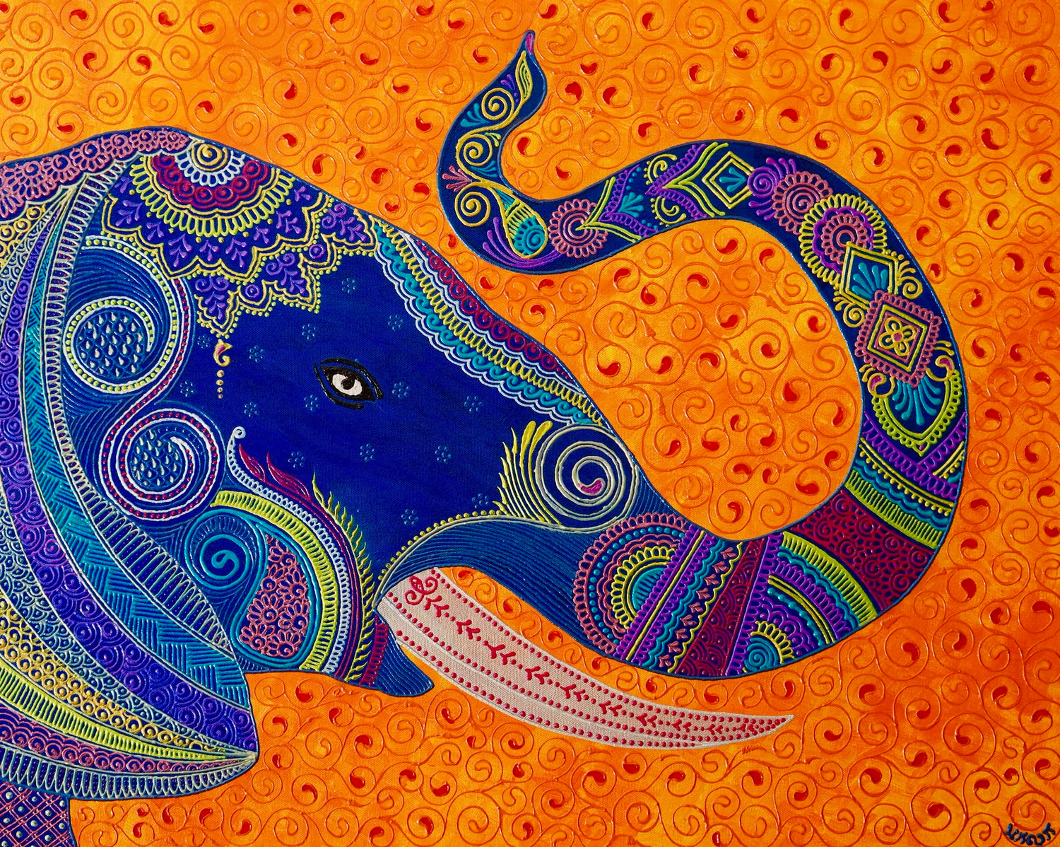 High Quality Photo print of the henna style textured Elephant Painting on metallic paper. Metallic paper has a unique surface that gives the artwork a metallic or iridescent look, adding depth and richness to the colors.