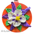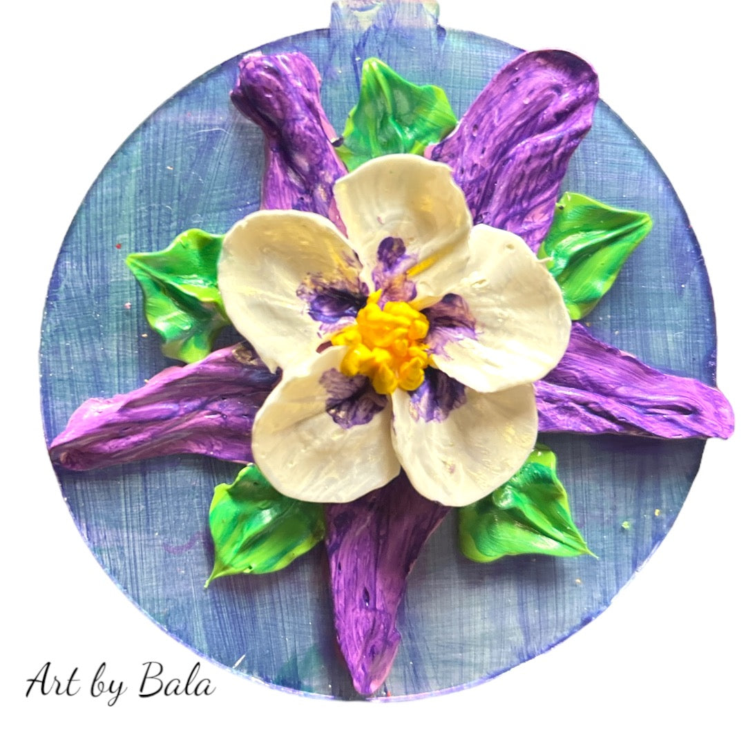 Original 3-inch sculpted floral ornament is crafted on a durable acrylic disc, featuring vibrant columbine flowers created with heavy-texture acrylic paint.
