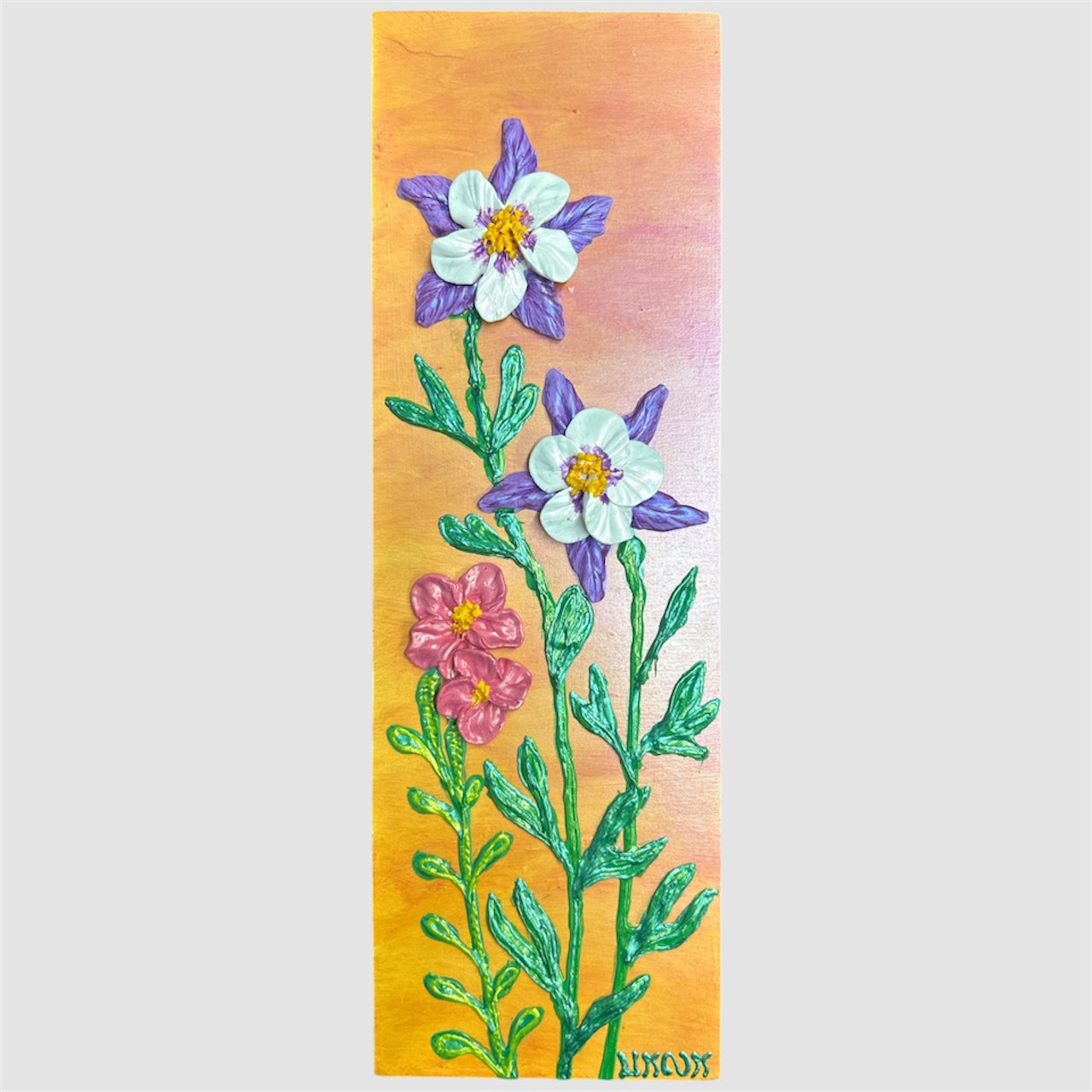 Columbines No. 3 reflects the graceful upward movement of the bloom in sculptural, hand-built detail. Created using a piping technique, each petal is individually formed in heavy-body acrylic and layered onto the wooden panel, resulting in a raised, dimensional surface that reveals the craftsmanship behind every mark.