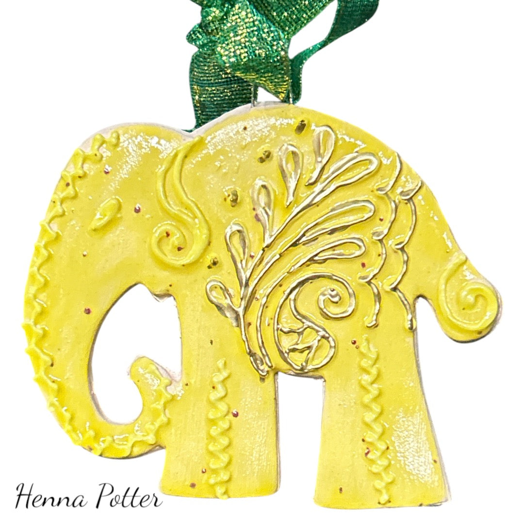 One-of-a-kind ornament, showcasing intricate slip-trailed, textured designs inspired by traditional henna art, hand built into a charming elephant shape. Each piece is made from ceramic, measuring approximately 3 x 4 inches, and is uniquely hand-decorated to ensure no two are alike. Part of the texture is highlighted with gold color to add an extra pop.