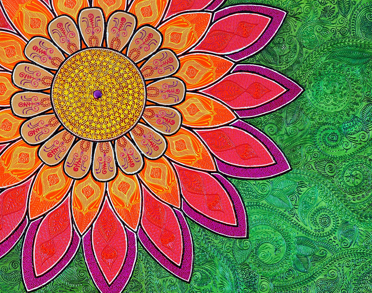 High Quality Photo print of the henna style textured flower Painting on metallic paper. Metallic paper has a unique surface that gives the artwork a metallic or iridescent look, adding depth and richness to the colors.