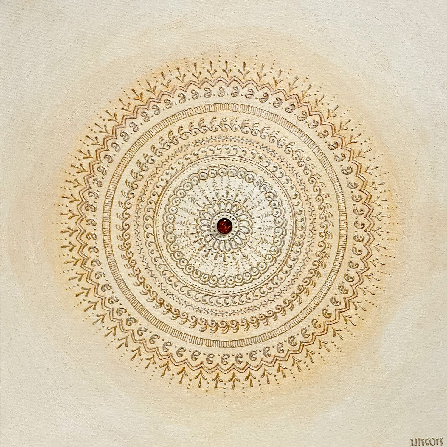 - Technique: Hand-piped henna-style sculptural surface with iridescent pigments