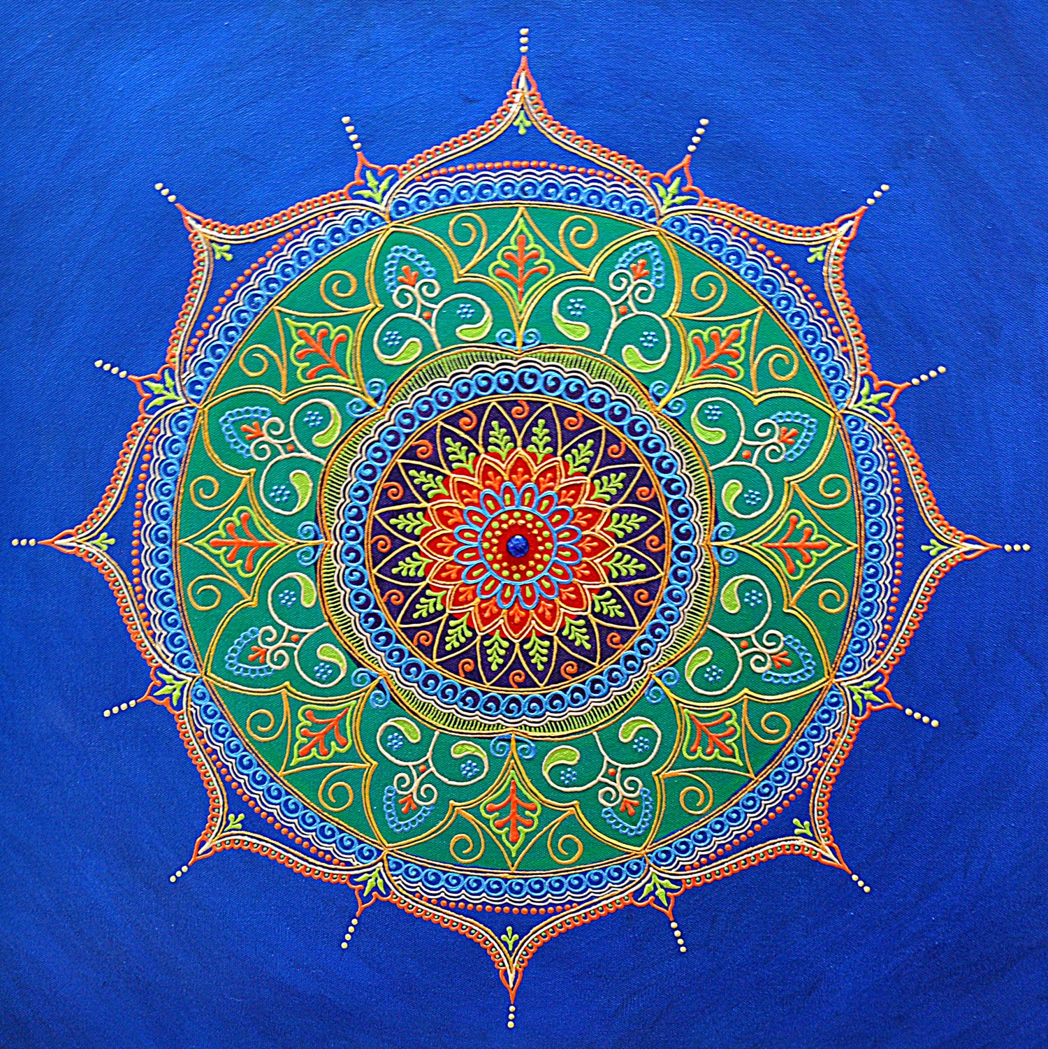 High Quality Photo reproduction of the henna style textured Spirit Mandala Painting on metallic paper. Metallic paper has a unique surface that gives the artwork a metallic or iridescent look, adding depth and richness to the colors.