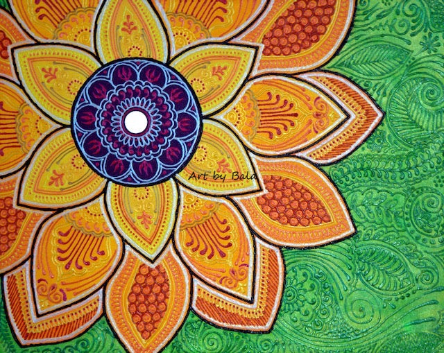 High Quality Photo print of the henna style textured flower Painting on metallic paper. Metallic paper has a unique surface that gives the artwork a metallic or iridescent look, adding depth and richness to the colors.