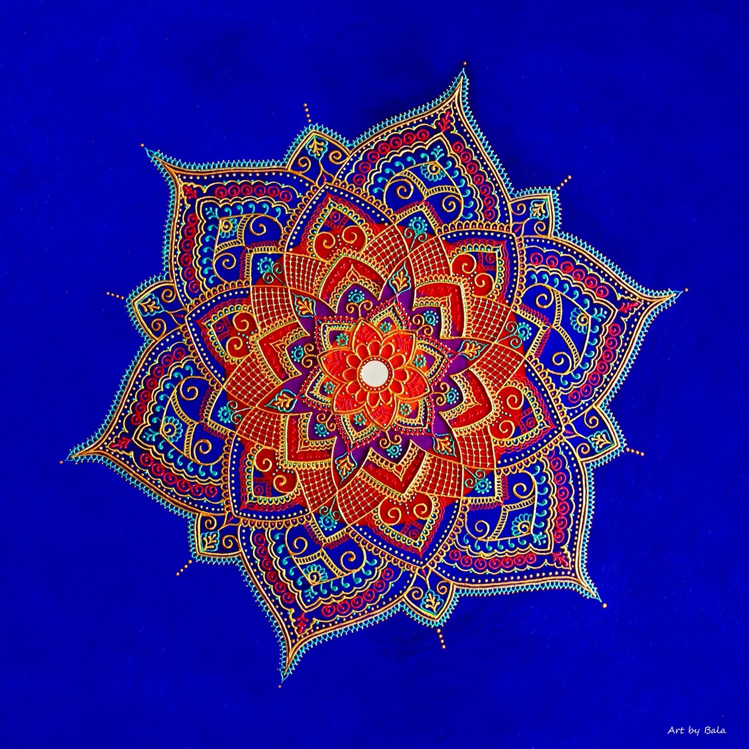 High Quality Photo reproduction of the henna style textured Vibrance Mandala Painting on metallic paper. Metallic paper has a unique surface that gives the artwork a metallic or iridescent look, adding depth and richness to the colors.